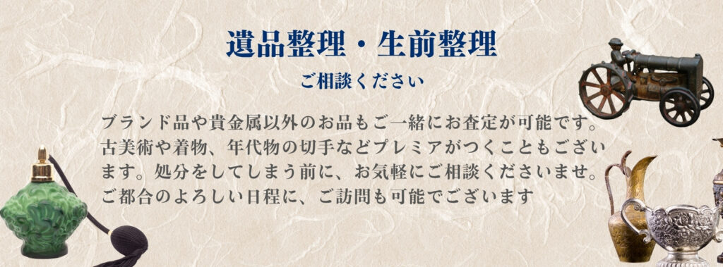 当店のモットーは、お客様の立場に寄り添う誠実な接客です。 お品物は、お客様が大切にされてきた思い出が詰まった宝物。だからこそ、一つひとつのお品物を丁寧に扱い、ご成約のその時まで大切にお預かりいたします。